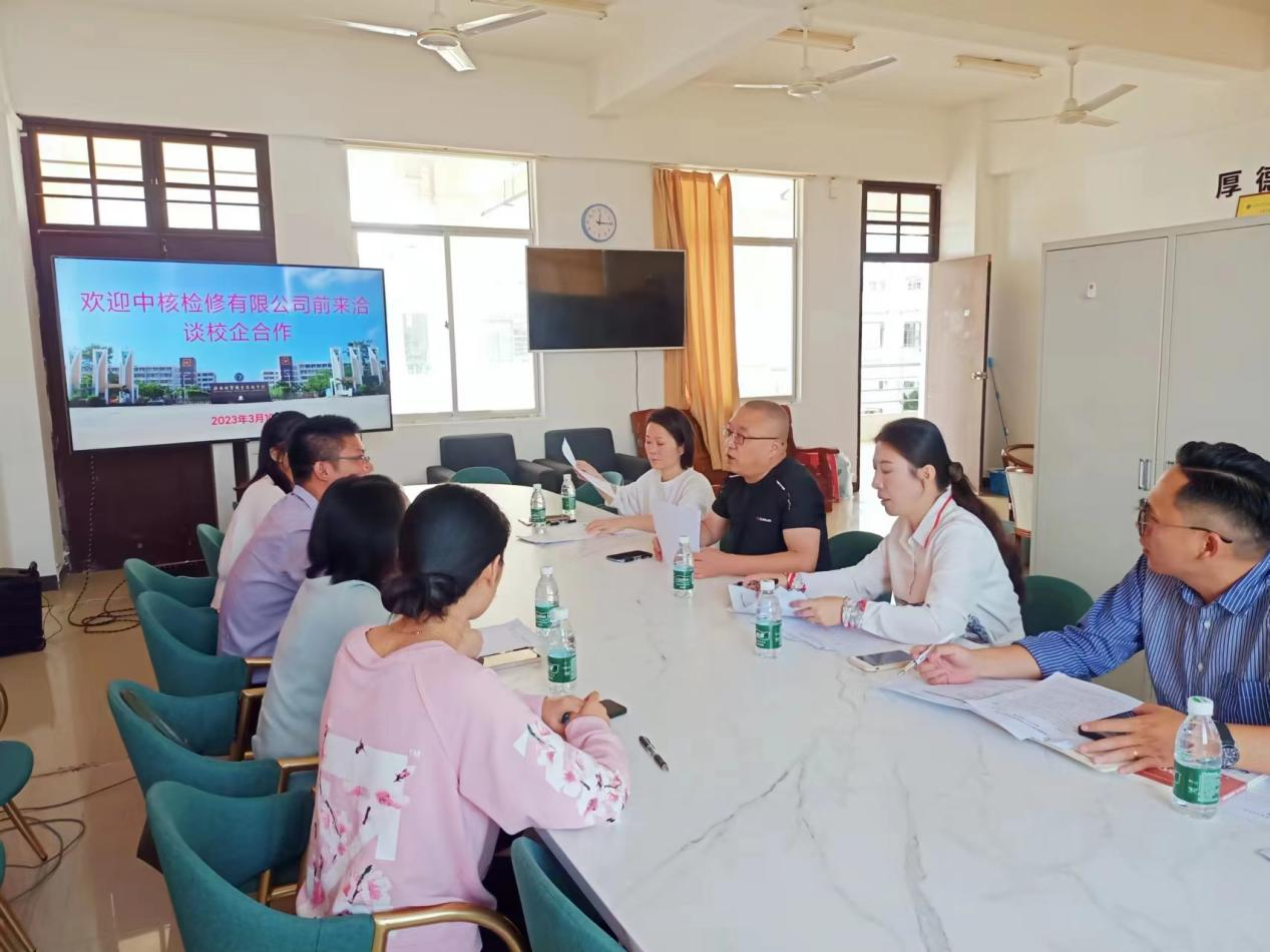 2023年3月10日上午,中核检修有限公司与我院在2教409会议室洽谈校企合作事宜,中核检修昌江分公司李经理郑重的介绍了中核检修有限公司的发展历程、企业文化、工作环境、生活条件,并从技术层和管理层介绍了员工晋升前景及发展空间。让我们看到,作为央企,中核检修公司实力之强大。