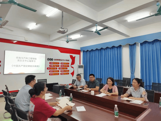学院党总支书记黄邦姬从党的纪律处分工作应当遵循的原则,对违犯党纪的党组织的处理规定,关于警告、严重警告处分影响和后果的规定,关于撤销党内职务处分影响和后果的规定,关于留党察看处分影响和后果的规定,可以从轻或者减轻处分的情形,应当从重或者加重处分的情形,关于共同故意违纪的处理规定等八个方面,深入解读了《条例》主要内容和新修订的内容。她强调,党员领导干部要自查自警,廉洁从政,甘于奉献,踏踏实实做事,不踩红线、守住底线,以更高的标准和更严的要求,为其他师生党员作出示范,为学校“双高”建设和申办本科职业大学作出贡献。