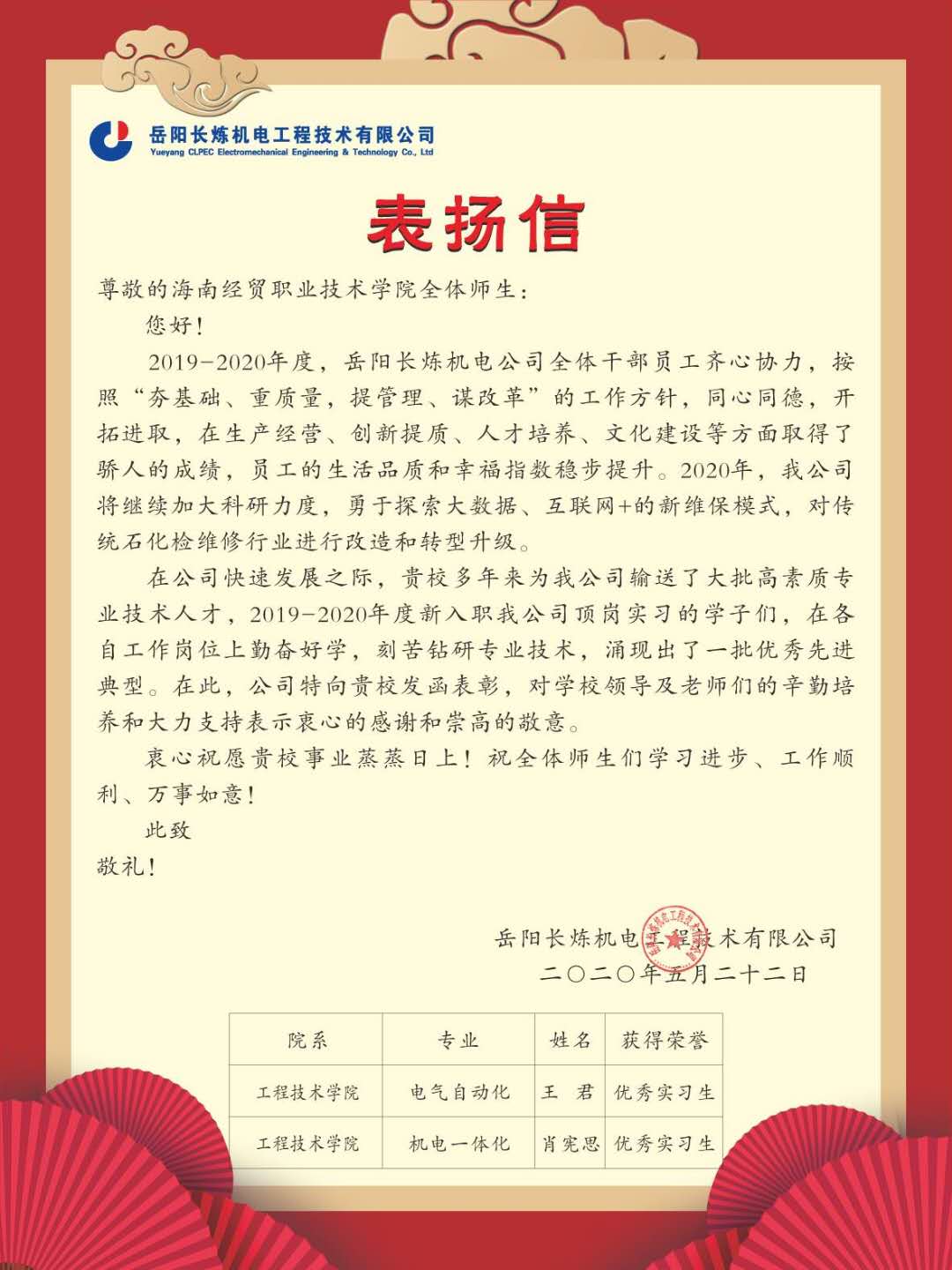 获得了岳阳长炼机电工程技术有限公司颁发的“优秀实习生”称号。