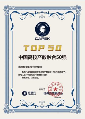 2022年8月26日-28日,第十二届中国国际机器人高峰论坛暨第八届恰佩克颁奖仪式在芜湖举行,大会以“遇见恰佩克、预见新未来”为主题,旨在大力推动产业集群发展,构建机器人产业发展新生态,贯彻落实数字产业化和产业数字化,加快构建现代产业体系。中国机电一体化技术应用协会会长李亚平、中国工程院院士谭建荣、中国工程院院士王耀南、俄罗斯工程院院士孙立宁以及国内外40位机器人领域顶尖专家参加了本届大会。海南经贸职业技术学院与清华大学、上海交通大学、西安交通大学、北京理工大学等50所高校荣获恰佩克奖“中国高校产教融合50强”奖项。