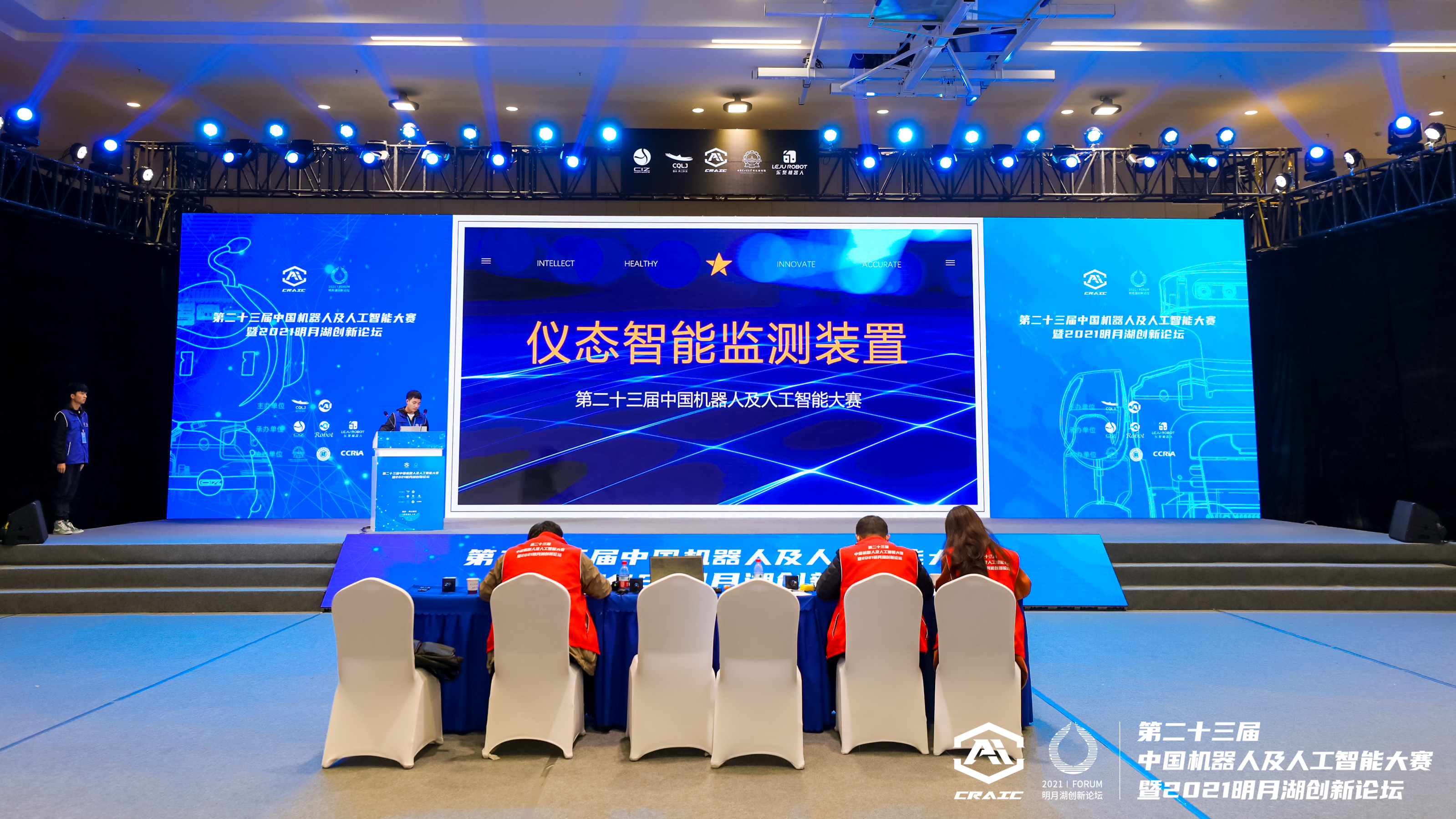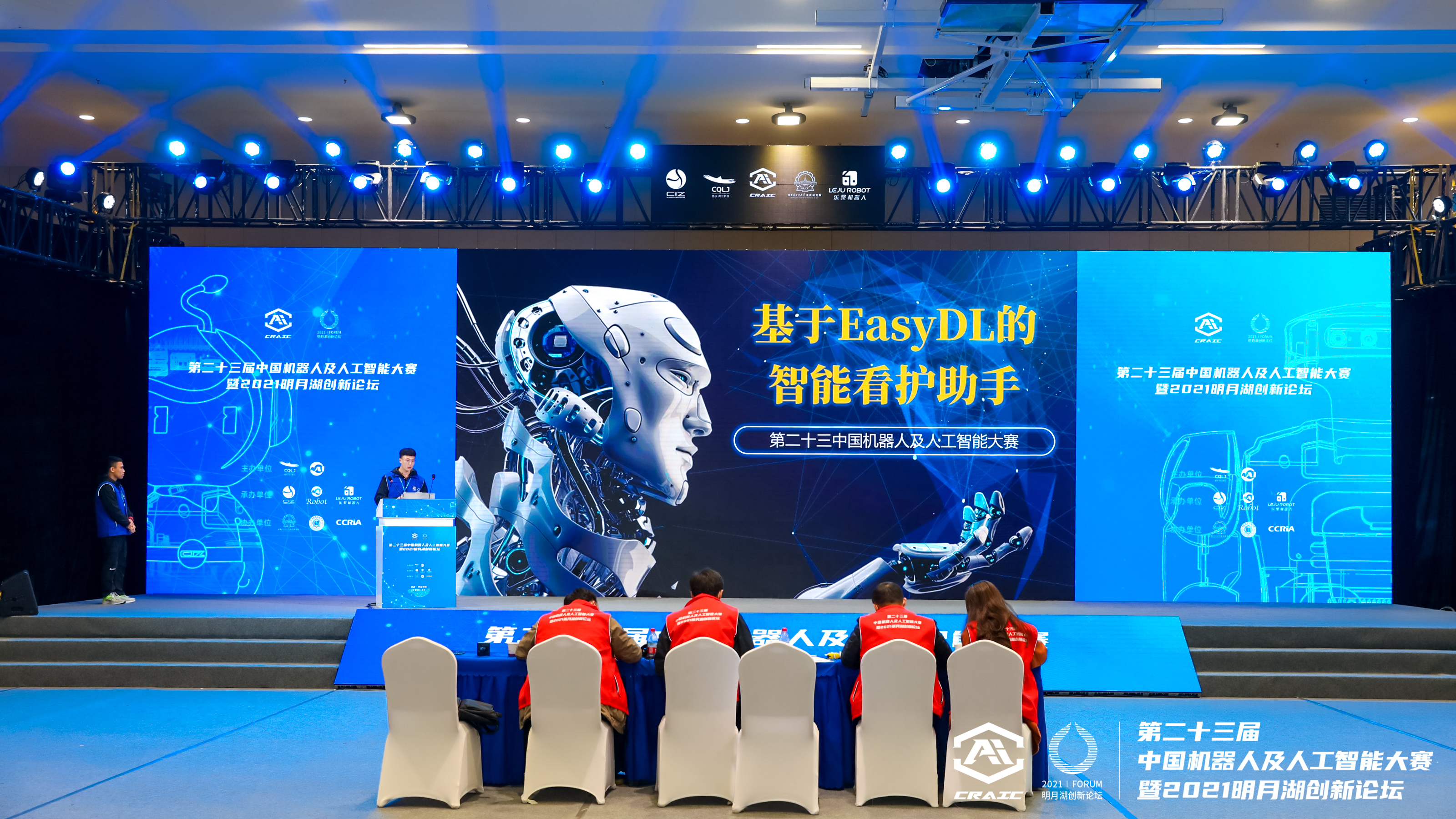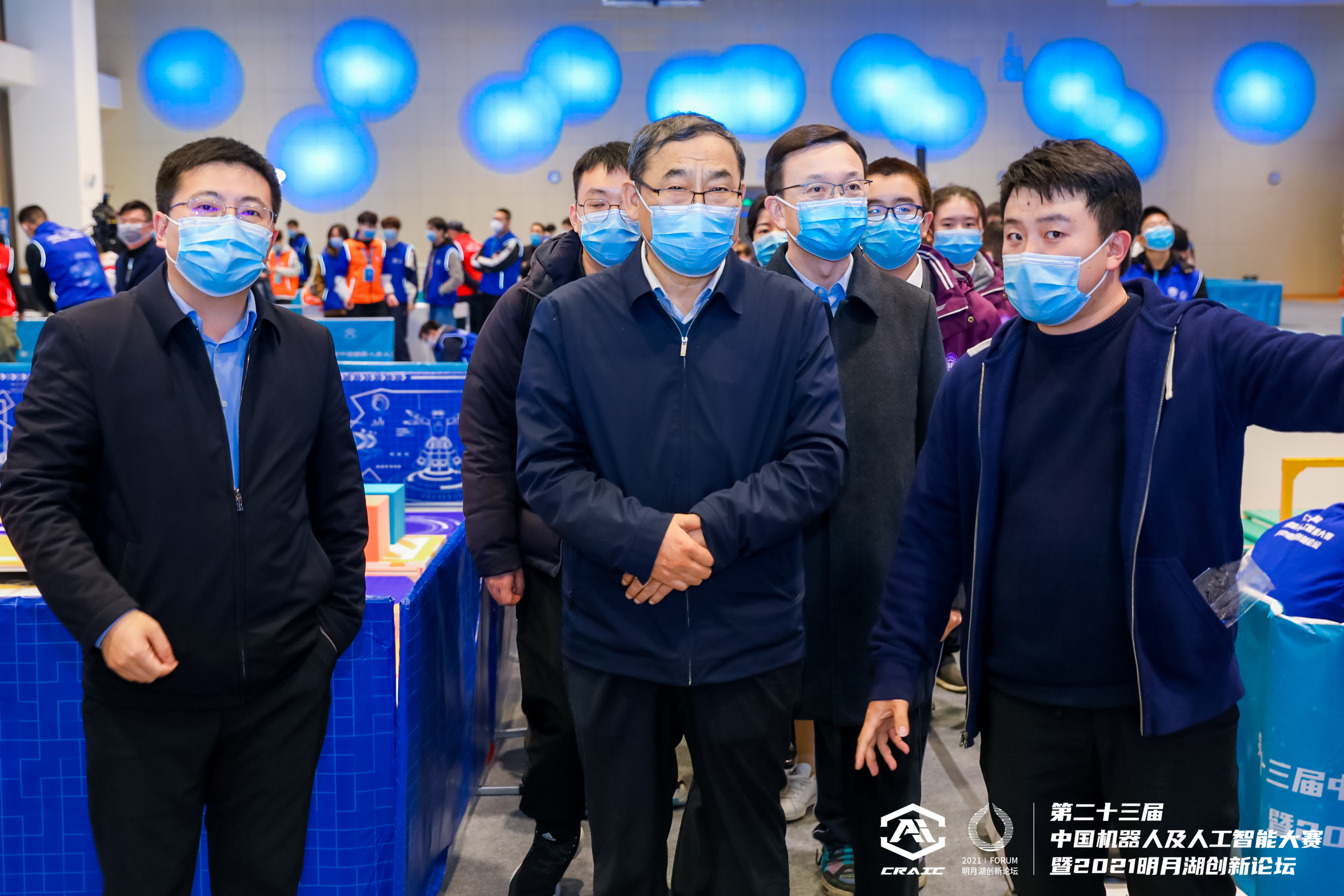 两江新区党工委副书记、管委会主任罗蔺,两江新区党工委委员、管委会副主任李洁,中国人工智能学会副理事长、重庆邮电大学副校长王国胤,国家杰出青年奖获得者、长江学者特聘教授、第二十三届中国机器人及人工智能大赛学术委员会主任孙立宁,松禾资本创始合伙人厉伟,中国科培教育集团董事长叶念乔,国家杰出青年基金获得者、中科院沈阳自动化所研究员刘连庆,国家杰出青年基金奖获得者、中国科学院深圳先进集成技术研究所副所长吴新宇,国际杰出青年基金奖获得者、西安交通大学教授兰旭光等参加。近100位机器人与人工智能领域的专家学者、行业领袖莅临,与参赛队伍、选手进行深入交流。