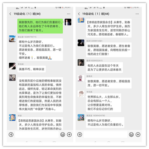 由于疫情的原因,今年的清明祭奠是特殊的,也是让同学们映像深刻的,我院学子们通过在朋友圈或者QQ空间等网络平台发表自己感想的方式祭奠英烈和逝世同胞,表达自己对英烈的敬拜;对祖国尽快战胜疫情、我们的生活越来越美好的温馨祝愿之情。