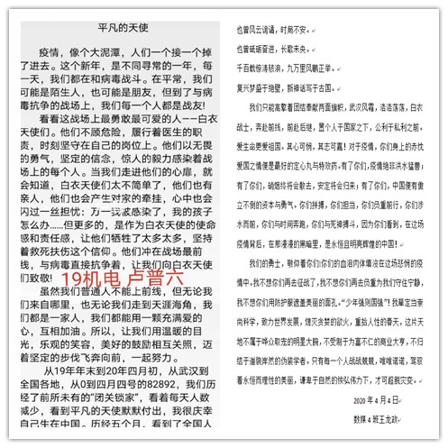 今年的新冠疫情对于全世界来说都是很不幸的一年,在我们遭受疫情危机的时候,英雄们挺身而出、不惧病毒、不怕流血,不怕牺牲,为我们负重前行,换来了我们的安全与保障,让我们的“春天”如约而至,可有些人永远的躺在了这次的寒冬,我们会铭记在心!在此我和各同学向英烈们致敬!