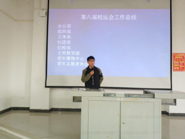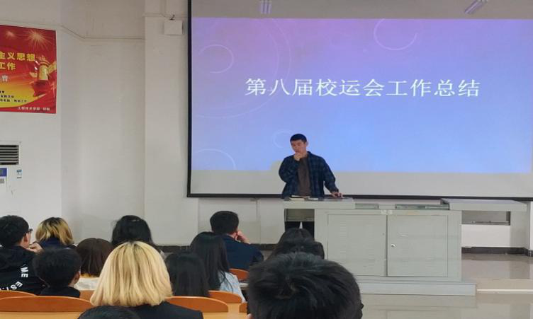 此次会议由工程技术学院团学青主席叶俊男主持,出席本次会议的有团学青全体干部、干事。主席叶俊男在此次会议中表示,虽然今年的运动会总分成绩未达到理想,但是我们学院在运动会期间保持了良好的活动秩序,正常的后勤保障,传承了公平竞争的优良作风,发扬了顽强拼搏的体育精神,并获得了体育道德风尚奖,是值得表扬的。随后由各部长依次进行工作总结,他们指出不足的地方分别有:部分后勤站点备水不足、检录点不能及时收取比赛号码牌、工作人员不能及时联系运动员等问题,并提出这些不足如何在以后的活动中进行改正,争取做到最好。