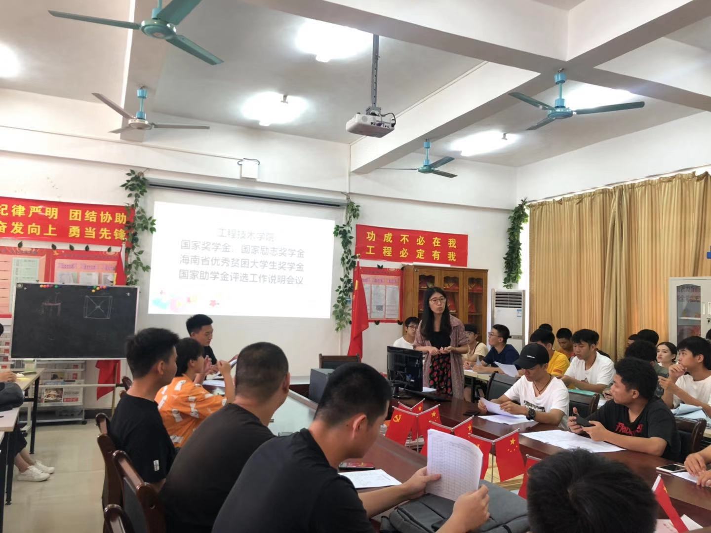郭蓉佳老师主持会议并带领各班长学习海南经贸职业技术学院学生工作处下发的关于“学院奖学金”评审工作、全日制残疾学生、特殊家庭经济困难学生减免学费和住宿费工作、国家奖学金评审工作、国家励志奖、国家助学金及海南省优秀贫困大学生奖学金评审工作的通知。随后向大家讲解申请各奖助学金的注意事项、所需资料、班级名额分配、资料提交时间。