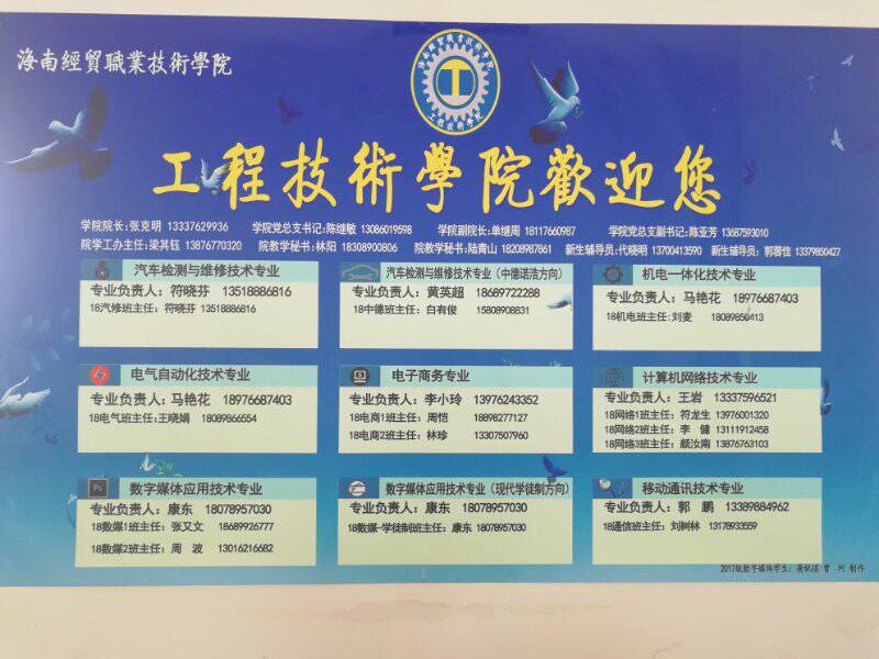 由学生服务中心2017级数字媒体技术学生蒋祝琪、曾珂联合制作工程技术学院欢迎您名片、创新创业、学生活动风采宣传栏,包含2018级新生辅导员电话,专业负责人电话,班主任电话,以及工程技术学院相关领导的姓名及联系电话,方便新生更好的了解和融入大学生活。分别粘贴在工程技术学院7栋、10栋、5栋学生宿舍以及工程技术学院公告栏区域。为了新生及家长更好的了解本院情况,2017级电商1班尚卓、2017级中德诺浩班李云飞专门制作了本院学生创新创业宣传栏、本院学生学生活动风采宣传栏,并在招生接待醒目处处悬挂学生活动相片100余张。
