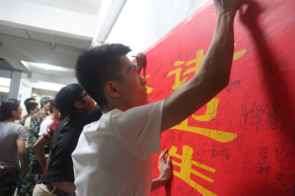 接下来,由陈继敏书记对学生到校承诺以及军训期间具体安排进行了详细说明。书记通过讲一些历史事件让同学们懂得纪律的重要性,明白没有铁的纪律,就没有钢的成就。针对我院工科学生的特点,特地制定了新生纪律制度,守纪律、懂礼貌、讲卫生、不旷课、不打架、不赌博,让每个新生在横幅上签名,承诺自己一定会做到这几点。最后,会议以全体成员庄严宣誓画上了圆满的句号。