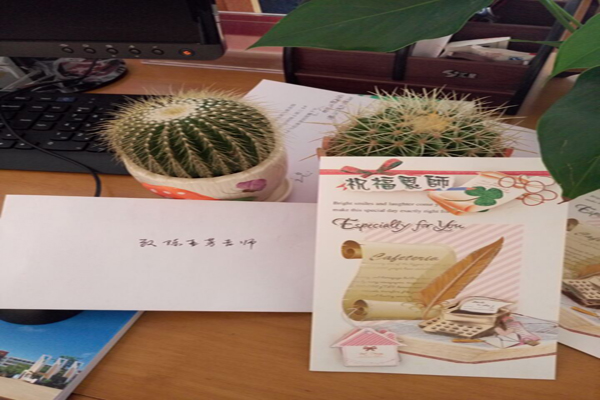9月10日清晨,由我院学生会主席魏锴和副主席黄丹负责教师节活动的开展。其中,由我院13、14级各班代表给我院全体教师送去了短信祝福,感谢辛勤工作的园丁们对我们默默地付出与无私的奉献;其次由各班同学写下最美的文字以贺卡的形式递送给老师,来表达对老师的敬爱之情;另外再给每位老师送去仙人球,仙人球代表老师的耐力、坚强、旺盛的生命力,不屈服的个性。通过这一系列的形式表达对老师无限的爱意、真心的祝福和由衷的感谢。