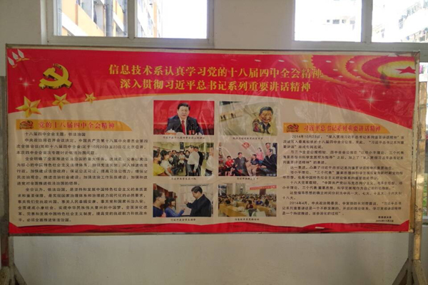 11月18日讯(信息技术系丁燕琴报道)为让我系学生认真学习党的十八届四中全会精神、贯彻习近平总书记系列重要讲话精神,系里特在我系系办以及学生公寓女生4栋、男生9栋一楼贴了关于十八届四中全会的海报。