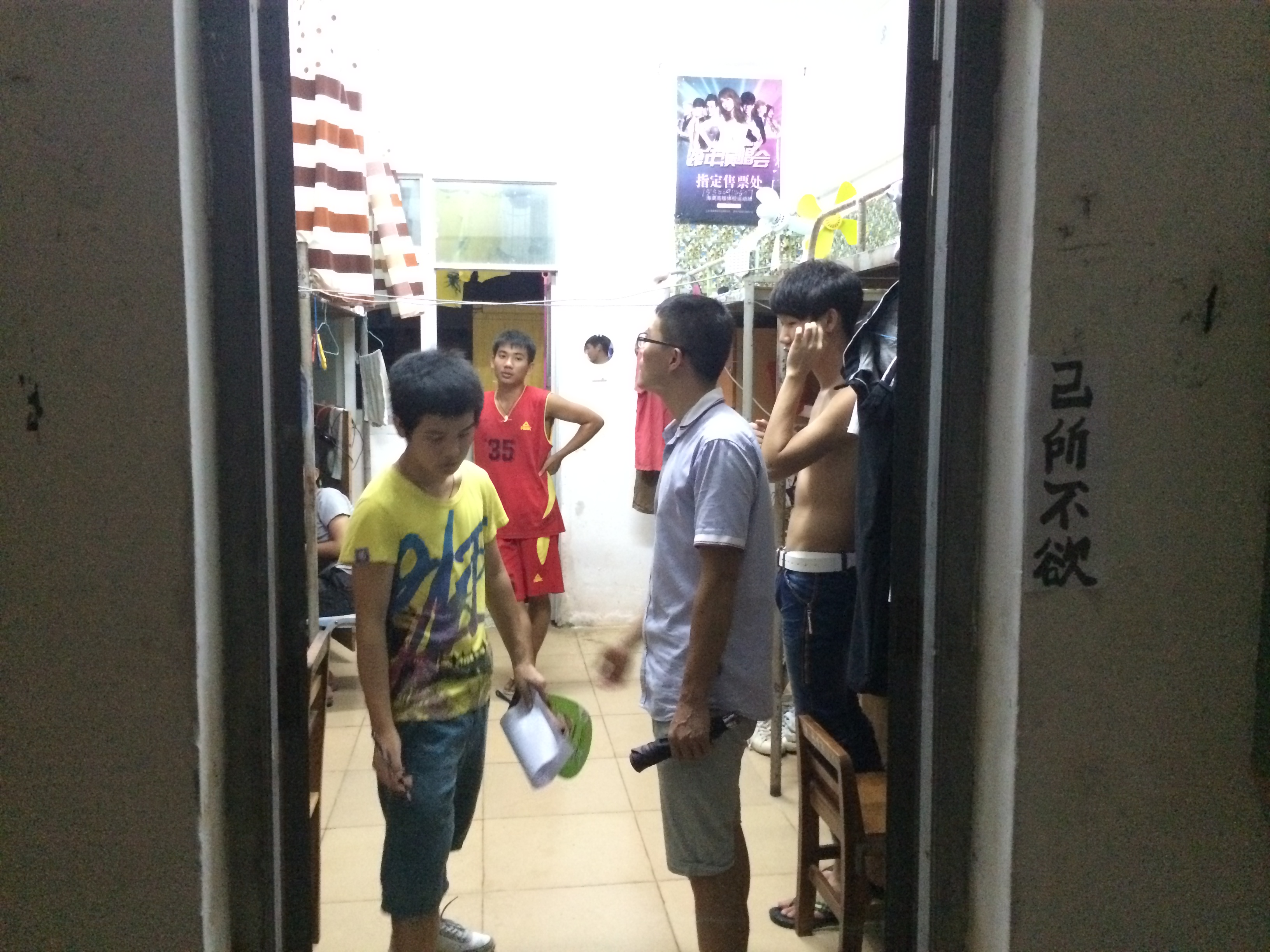 所有成员在书记和各个老师的带领下,分四组同时展开,两组检查九栋男生宿舍,另外两组检查四栋女生宿舍¥。检查主要针对床铺整洁,地面卫生、物件摆放、死角清理、墙面门窗、爱护公物、Υ章Υ纪、创新奖励进行综合评分。检查中还从正面反面进行拍照,旨为督促同学们向优秀宿舍学习。检查过程中同学们认真负责,宿舍成员们也积极配合,û有抵触情绪。