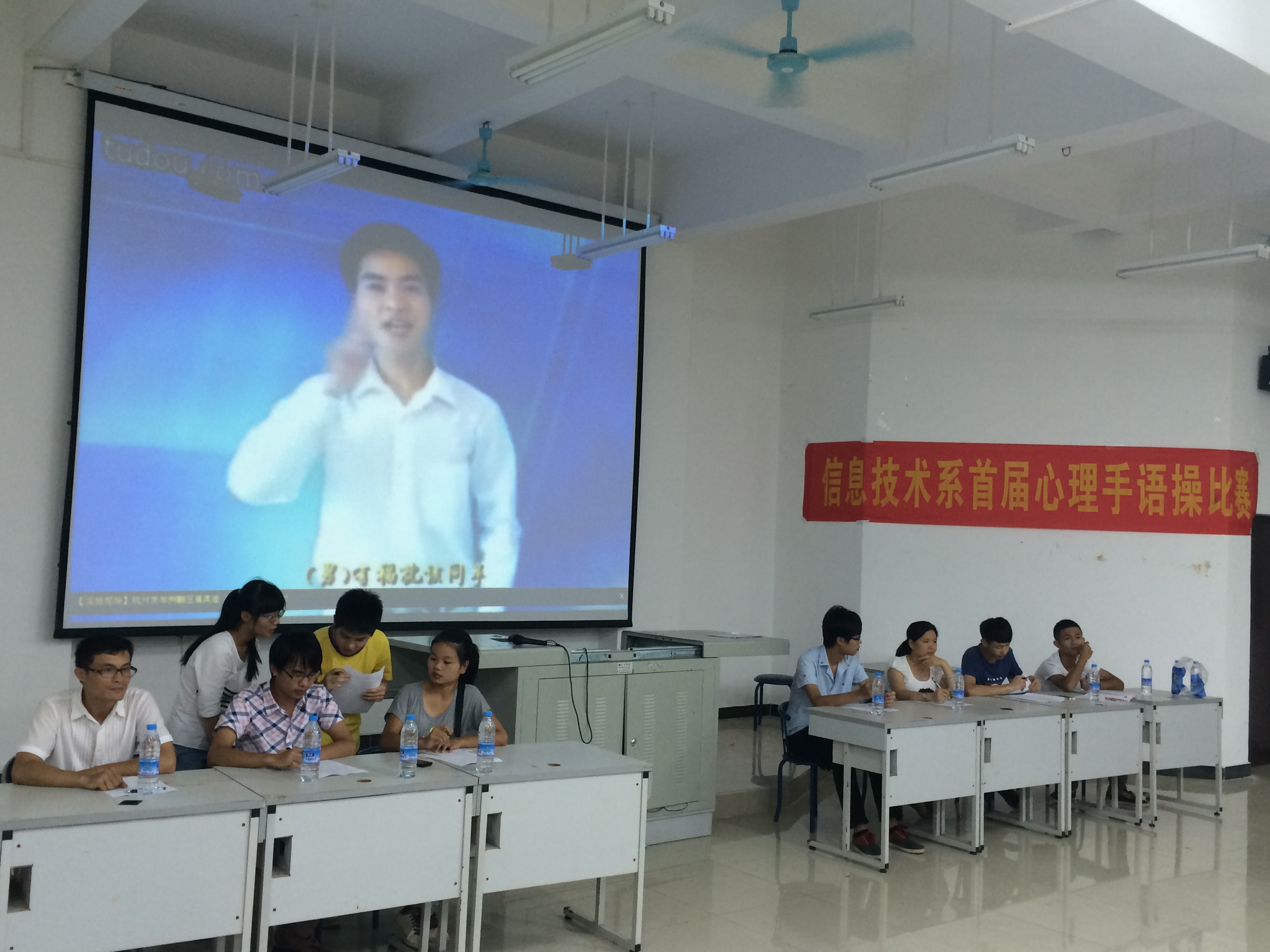 本系6月13日讯(信息技术系 钟超报道)“让心灵在双手中舞动,让关爱于指尖处绽放”,由12级学生会心理部部长谭业同学组织策划的手语操比赛,于6月12日晚7:30分,心理手语操比赛在本系2栋教学楼408教室内举行。本系13级全体新生共同参与了本次手语操比赛。此次比赛评委从每班选出一个代表,然后进行综合评分,本着“公平、公正、公开”的原则,一旦到自己班的比赛队伍,代表本班的评委将不能参与评分。本系党总支书记陈继敏出席了比赛并担任观察员,陈继敏书记在比赛现场发表了重要讲话,他指出:“手语操作为一种表达思想情感的特殊方式,是集体参与进来的心理保健操。学生在优美的旋律、抒情的动作中,感情与意境相融合,肢体语言与心理情感相协调,达到强身健体同时用肢体宣泄法把自己身体的许多情绪,尤其是负性情绪释放出来,愉悦身心、提高自信心,感悟生活的美好、体味人生的真谛,达到内在与外部的完美统一”。